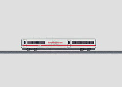 Voorbeeld: Restauratierijtuig type WRmz 137 van de Deutsche Bahn AG (DB AG). Drukverbeterde uitvoering met SIG-overgangen voor het langeafstandsverkeer. Kleurstelling van het langeafstandsverkeer, lichtgrijs met verkeersrode sierstrepen. Traject: IC 2013 van Dortmund naar Oberstdorf. Wagenindelingsnummer 11. Zoals in gebruik rond 2003.