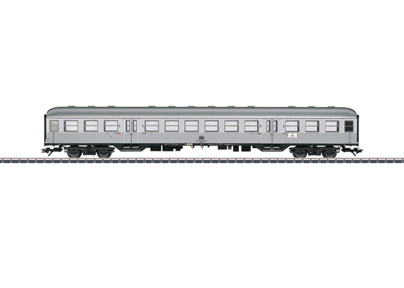 Voorbeeld: Coupérijtuig Bvmkz 856 2e klasse van de Deutsche Bahn AG (DB AG). Drukverbeterde uitvoering met SIG-overgangen voor het langeafstandsverkeer. Kleurstelling van het langeafstandsverkeer, lichtgrijs met verkeersrode sierstrepen. Traject: IC 2013 van Dortmund naar Oberstdorf. Wagenindelingsnummer 7. Zoals in gebruik rond 2003.